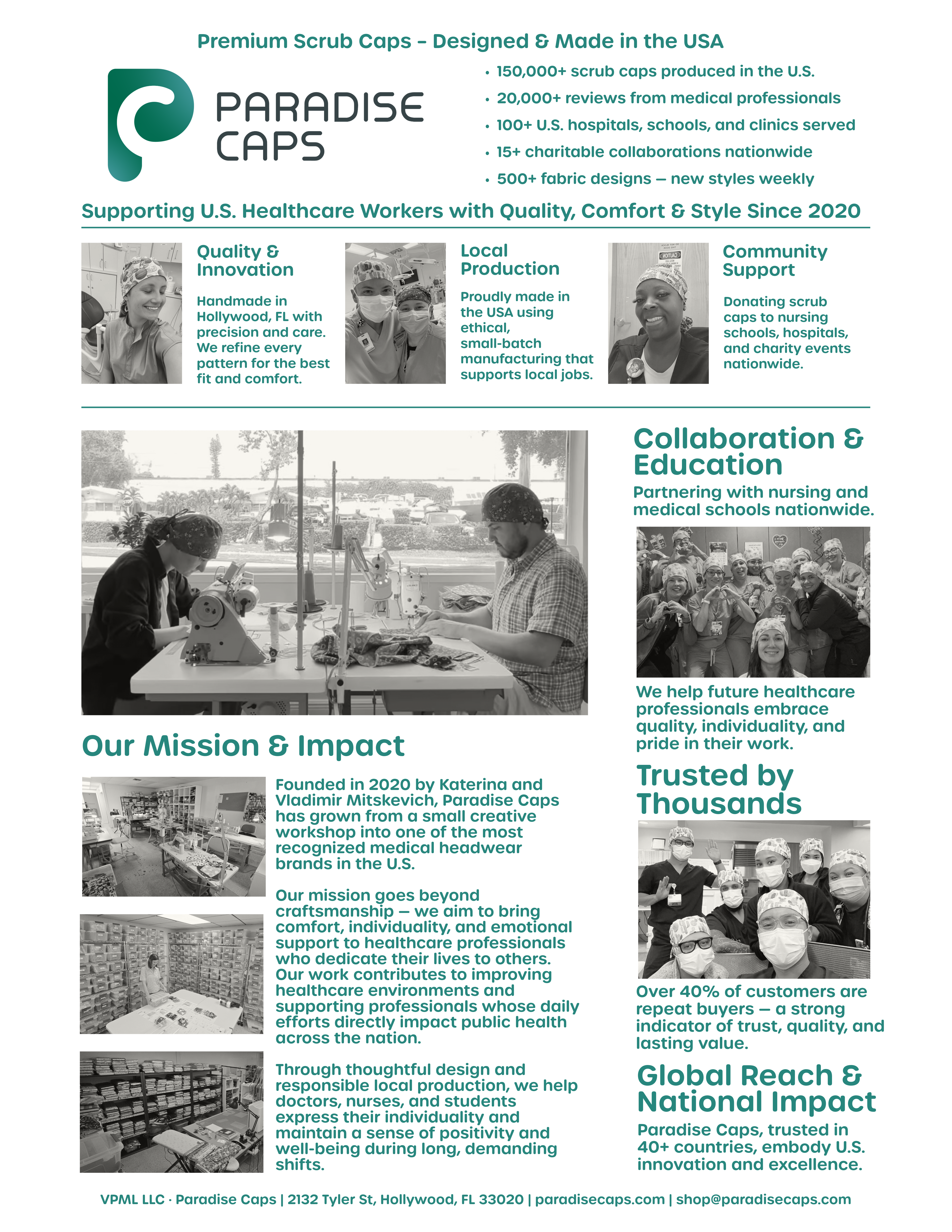 During the pandemic, with hard work and dedication, we sold thousands of masks on Etsy. This inspired us to focus entirely on handcrafted medical headwear, leading to the founding of Paradise Caps in November 2020.