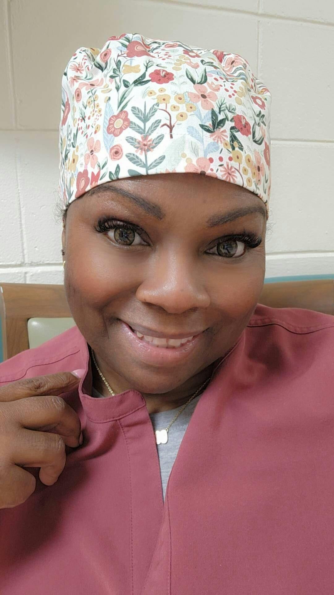 Floral Ponytail scrub cap for women with satin lined option by Paradise Caps.