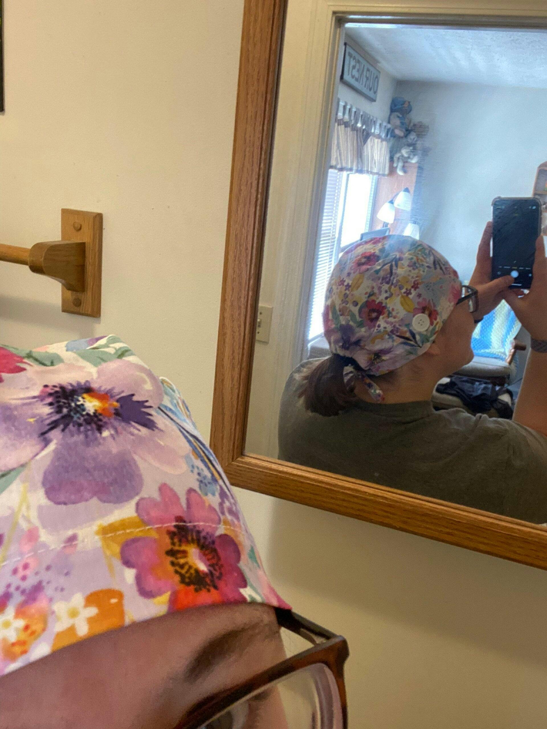 Purple flower Skull tie-back style surgical scrub cap by Paradise Caps.